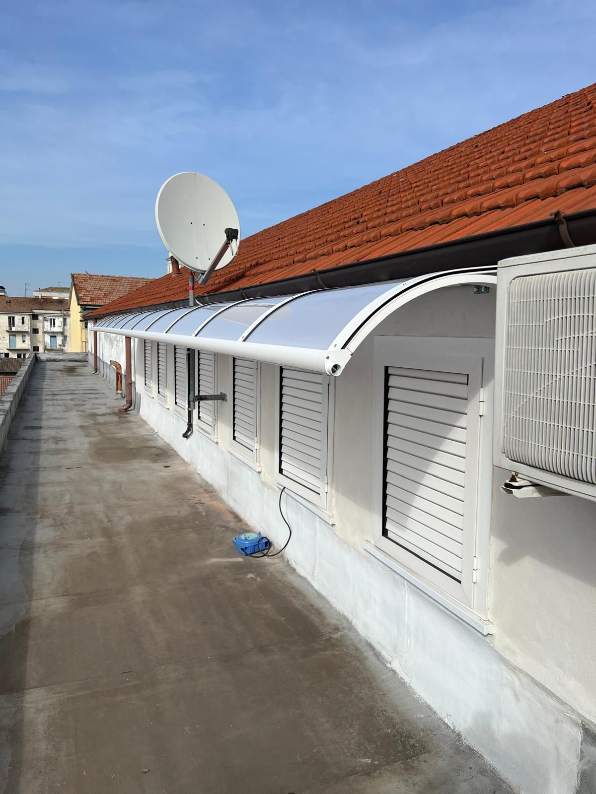 Con le sue linee moderne, grazie alla struttura in alluminio e copertura in policarbonato protegge gli infissi, le porte d'ingresso e gli spazi esterni dalle intemperie.