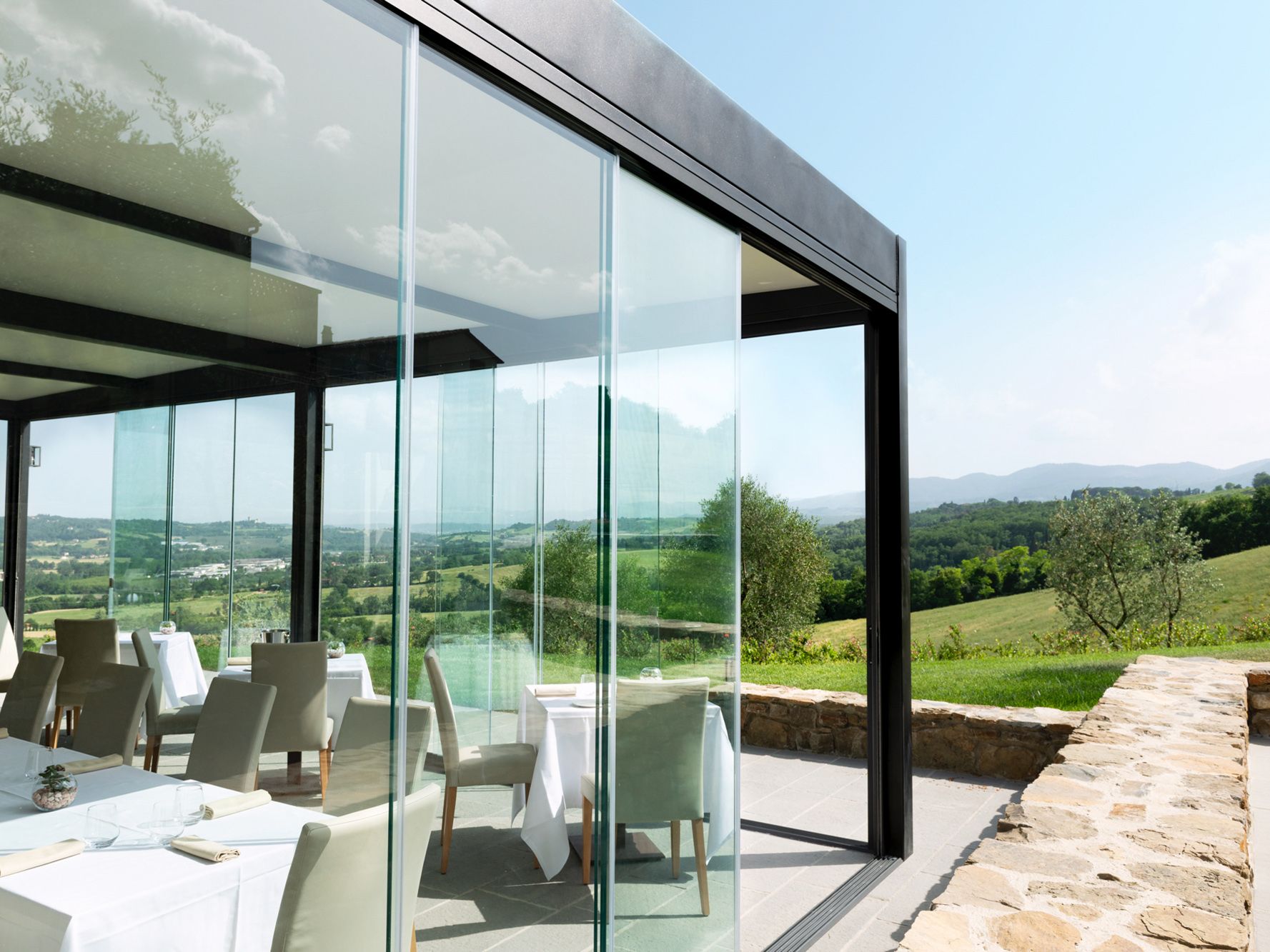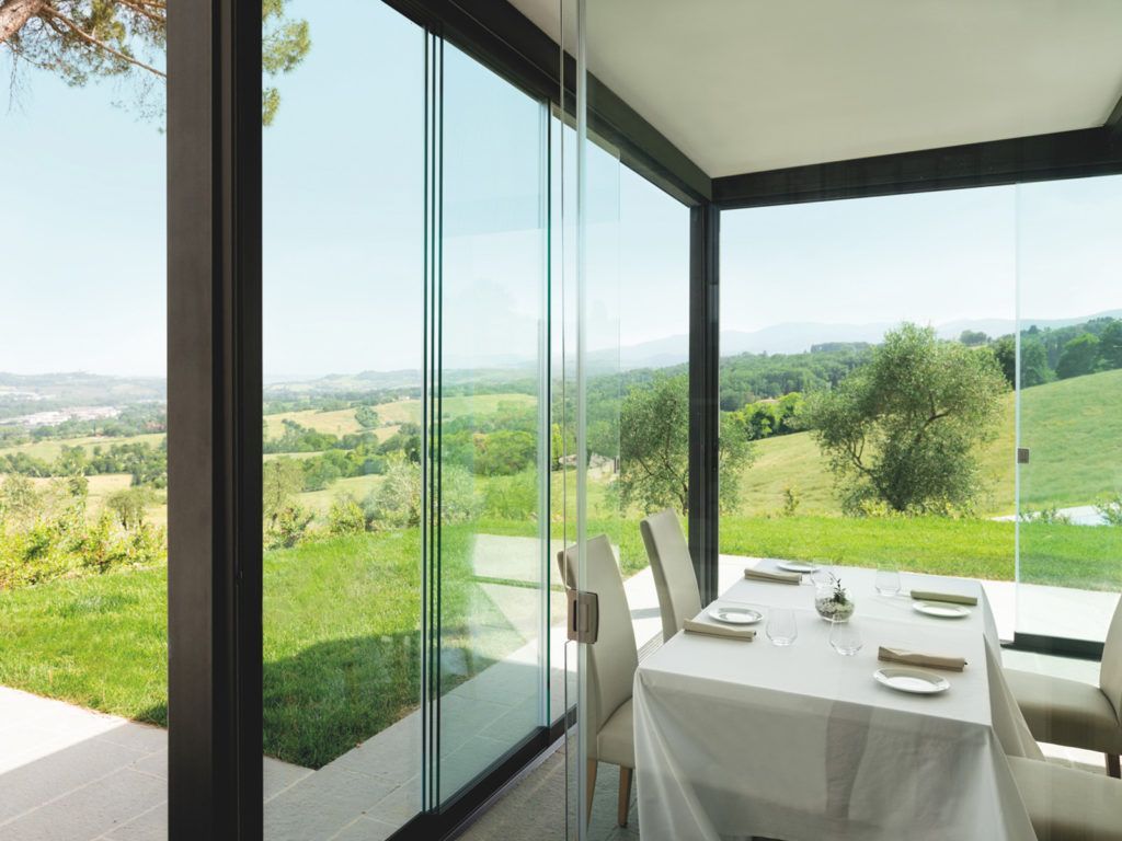 Le grandi vetrate in cristallo consentono di ottenere un forte impatto estetico, una flessibilità di apertura del 80% grazie a un innovativo sistema di aggancio dei pannelli.