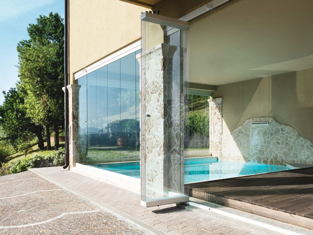 Le vetrate impacchettate sono vetrate panoramiche richiudibili in pochi minuti, grazie ai pannelli che si possono ruotare di 90°, consentendo un'apertura totale del sistema fino al 97% della sua estensione.